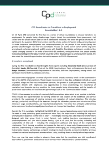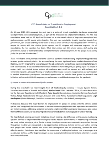 The final element is the materials from our Transitions to Employment roundtables held virtually between April and June. Organised and convened by CPD, the roundtables considered interventions that government, business and philanthropy could pursue to tackle long term unemployment and underemployment for the groups in our society facing the greatest disadvantage. Each roundtable was made up of a range of experts from government, civil society and the private sector, and focussed on a specific cohort of jobseekers. The first two discussions focussed on the long-term unemployed and underemployed, and people with disability. The second two roundtables focussed on people in contact with the criminal justice system, and vulnerable migrants and refugees. The roundtables were able to consider the impacts of COVID-19 and what the pandemic means for the range and scale of responses that must be considered.