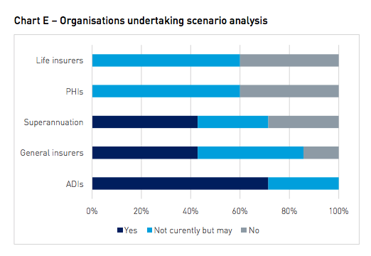 Recent evidence points to a fragmented and inconsistent approach to climate risk governance and reporting. A September 2018 review by ASIC found that only 17% of 60 ASX 300 companies surveyed by ASIC had disclosed climate material climate risks to their business, and that broader voluntary disclosures were often “fragmented”, “too general” and “not comprehensive enough” to be useful for investors. A March 2019 survey by APRA found that while awareness of climate risk was increasing, only seven of 38 respondents from the banking, insurance and superannuation sectors had disclosed risks in line with the TCFD framework – and almost half did not intend to use the framework in future. APRA also found that only one-third of respondents had conducted climate scenario analysis, despite clear signals that using these scenarios is a critical element of a sophisticated response to climate risk: