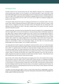 This discussion paper examines the impact of increasing cultural diversity on our education system in two main arenas: firstly, variation of educational outcomes of LBOTE students and, secondly, enrolment in schools. In both cases, ethnicity is mediated by social class, and indeed, divisions and inequalities that may initially seem to be explained by ethnic difference are often in fact about unequal access to the economic and other resources required for educational success.