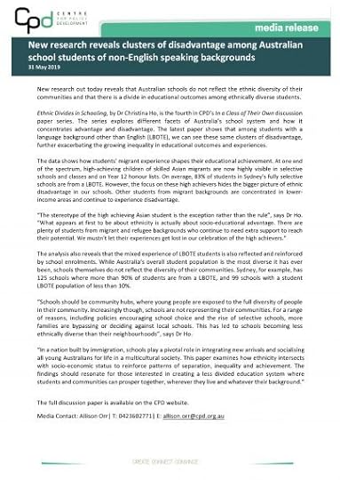 In late May, CPD published the fourth discussion paper in our In a Class of their Own series, written by Christina Ho. The paper reveals that Australian schools do not reflect the ethnic diversity of their communities and that there is a divide in educational outcomes among ethnically diverse students. The series explores different facets of Australia’s school system and how it concentrates advantage and disadvantage. The latest paper shows that among students with a language background other than English, we can see these same clusters of disadvantage, further exacerbating the growing inequality in educational outcomes and experiences. You can find the full paper here.