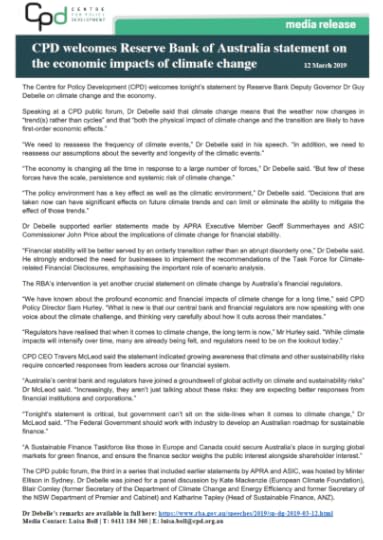 Dr Debelle’s speech was covered widely across Australia and overseas. You can find links to the speech, the audio of the forum, and the roundup of media coverage of this full-house event here. APRA has followed Dr Debelle’s speech by releasing its first climate risk survey this week, in which CPD’s work featured prominently.