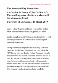 CPD Chairperson Terry Moran AC delivered the Jim Carlton Integrity Lecture 2019 on ‘The next long wave of reform — where will the ideas come from?’ at the Accountability Roundtable in Melbourne on 25 March. In his address, Terry laid out how he views the next wave of reform and the key steps he thinks must be taken as part of David Thodey’s review of the Australian Public Service. The speech was timely given David Thodey’s speech in Canberra last week.