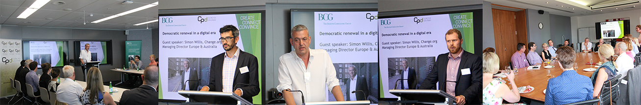 Above: CPD hosts Simon Willis from Change.org at roundtables in Sydney and Melbourne, with generous support from BCG and ANU House Melbourne.