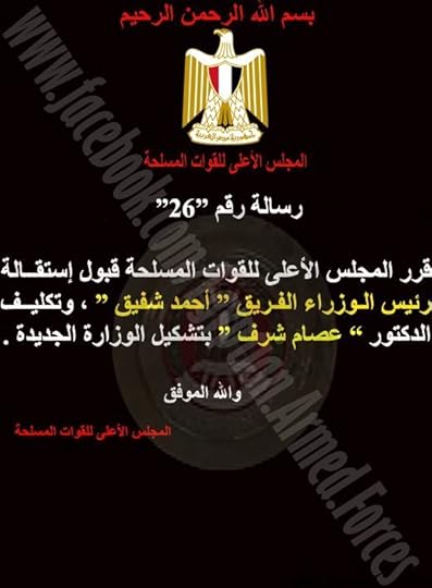 Il comunicato numero 26 annuncia le dimissioni del premier Ahmed Shafiq, che aveva ricevuto l'incarico di presiedere il governo dal presidente Hosni Mubarak, nei primi giorni della rivoluzione. Dimissionato Shafiq, come chiedevano da giorni i ragazzi di Tahrir (e non solo loro), e subito sostituito con Essam Sharaf.
