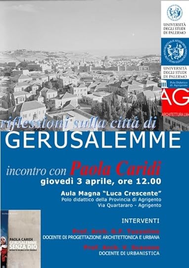 Comunque, aggiorno il blog per dirvi che il 3 aprile alle 12 sono di nuovo ad Agrigento, dopo la presentazione di Gerusalemme senza Dio della settimana scorsa. Questa volta all’università, invitata da Valeria Scavone (grazie!) a parlare di urbanistica, piani regolatori, cemento e pietra bianca, identità, stratificazioni, etc etc… Ci sarà Gianfranco Tuzzolino, e suppongo parleremo delle città a impianto islamico (si dice così? forse).