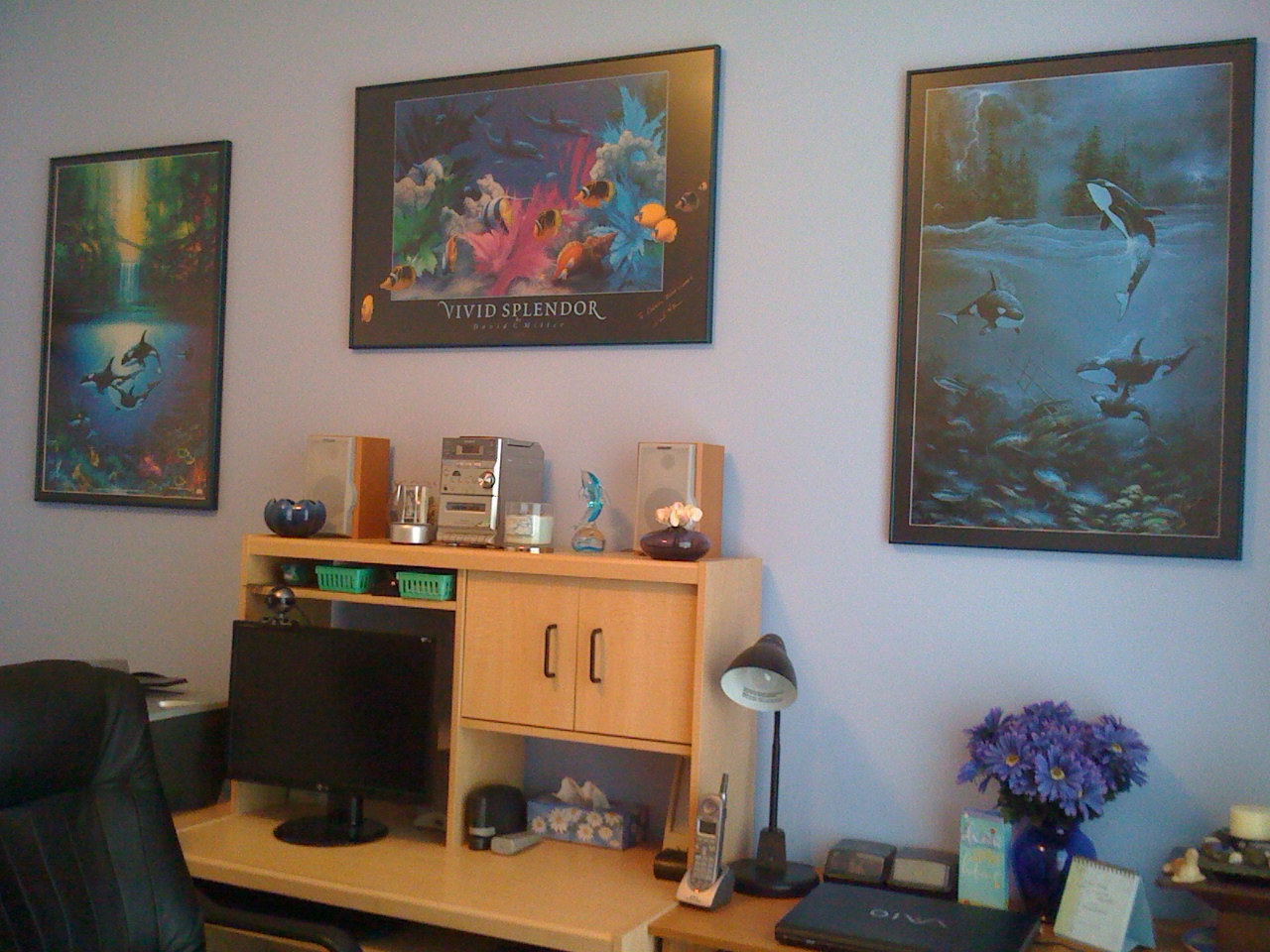 I bought the print above the chair from one of my other favorite artists--Aynsley Nisbet. The painting is called "Whale Song". Yes, it's the same name as my novel; that's because she was inspired by my novel to paint it. If you read the new trade paperback edition of Whale Song, you can read her full story. I promise you, it's very inspiring.