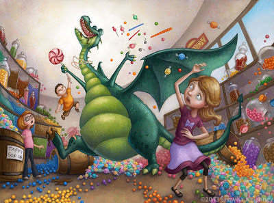 I recently finished an illustration about a Dragon in a Candy Store. He is a little overly excited! I made a process video that shows the preliminary stages- thumbnails, sketches, gray scale study, color study, and then the painting process to the final. Hope you like it, and if you do, like it on Youtube and share it with your friends! Thanks!