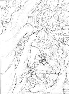 I ended up making two tight sketches because I liked two of the angles from the thumbnails. I ended up using the second composition, because I felt it focused better on the main characters and what was happening in the main story.