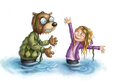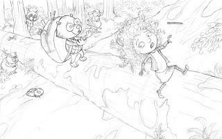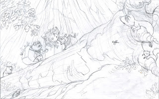 On the next part of the assignment, I was to choose a spread with an interesting composition, and take it to a final illustration for the conference critique. I liked the composition with B.Bear and Lolly walking over the river because of the way the log could be used to make a fun dynamic composition. I drew several more thumbnails of compositions thinking of different angles and which way would be the best for telling what the story was really about.