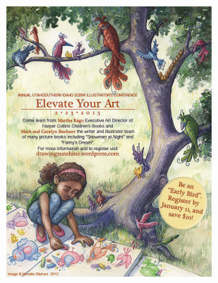 Illustration by Manelle OliphantJust a reminder for all you illustrators who live in or around Utah, the Utah/Southern Idaho Illustrators Conference, Elevate Your Art is on February 23, 2013. The last day for Early Registration is January 11 so register soon if you want to save $10. You can read all about the conference here. You can now register on the SCBWI website here. Sign up soon if you would like to participate in the Illustrator's Intensive with Martha Rago (Art Director at Harper Collins Children's Books)- there are only 25 spaces available! Mark and Caralyn Buehner will also be speaking about writing and illustrating. There are only 65 spaces in the conference all together, so spread the word to your illustrator friends, and sign up soon! This conference will be awesome!