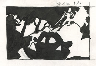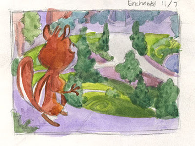 I failed to report yesterday because it was a pretty busy day. I went to a planning meeting for an awesome SCBWI illustrators conference we are going to have in the Salt Lake area in February. More details to come soon! I also finished a sketch for a project I have been working on for a while. Today I have already read a couple pages from Framed Ink and The Imagineering workout. I also did this very quick composition and color study- in pencil and watercolor- again from the beginning of the movie Enchanted. I love this dynamic overhead view over the garden. I failed to draw the two figures on the path which would have helped with the scale change in the composition. Oops! I also discovered with delight that they used a triad color scheme, my favorite- orange, purple an green. What a great learning experience I just had and in just a few minutes!