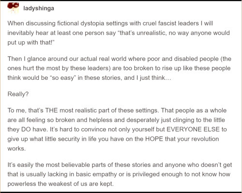 The Tumblr blogger @saffronhare says, “I’m commenting here not as a literary scholar or even as a person who reads a wide variety of SF, but I am a professional communicator. Part of what I think happens is that storytellers bring an audience through certain levels of agreement and acceptance in the process of world-building. Before we can get a person to believe in what a better future could look like, there is the work of getting that person to agree on the extreme effed-up-ness of things.” Great point! I suspect this is a major reason we see so many more dystopias than utopias.