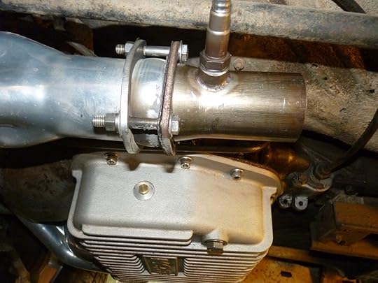 Other under-car hijinks included installing this collector-reducer onto the header. Note the newly installed oxygen sensor that tells the EFI system how much oxygen and unburned gasoline is in the exhaust: