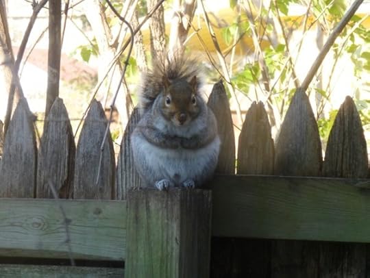 In other urban-wildlife news, my buddy Spot the Squirrel has taught two of his buddies (first-year squirrels) his little trick for getting food whenever he's hungry: First, he draws attention by standing on the fence outside the kitchen window, looking cute while trying to catch your eye: