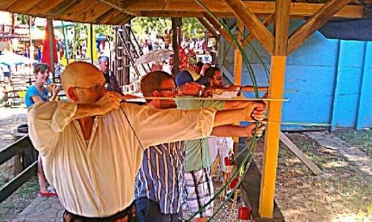 On Sunday, after getting a bunch of work done, I got together with a bunch of friends to celebrate a birthday. Said friends then headed over to the Kansas City Renaissance Festival on Monday, where we practiced archery (only Matt hit the bullseye in 7 shots):