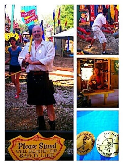 Went to the Kansas City Renaissance Festival Since the KC RenFest opened three weekends ago, I've gone three times! Different goals each time, with next time being a group trip to the Barbarian Battles region, where I intend to pummel my friends with foam swords. This last weekend, I caught a whole bunch of shows and finally rode the bungee-trampoline. HOLY COW was that fun! I aimed for the sky, and reached a good 30 feet or more toward it. The combination of trampoline below + gnarl of bungees attached to each side of a climbing harness = HUGE AIR. I leaped so high that the bungees were actually pulling me down from the top of the arc, above the telephone-pole uprights, and after shooting back down and hitting the trampoline, I sank in knees-bent several feet before it launched me back up again. Did this for many minutes in a row, and my ankles were shaky afterward. My gnarly old pirate assistant stopped me after my first backflip: "No more flips for you," he said. Followed by, "You made me tired just watching you."