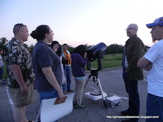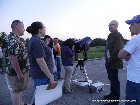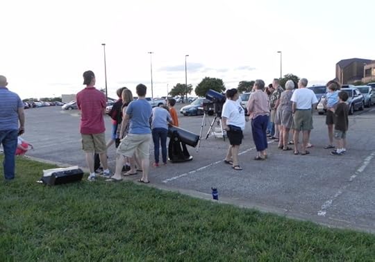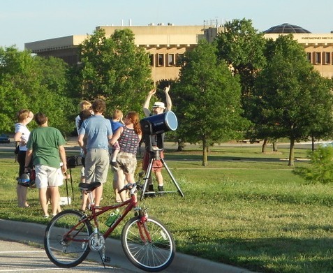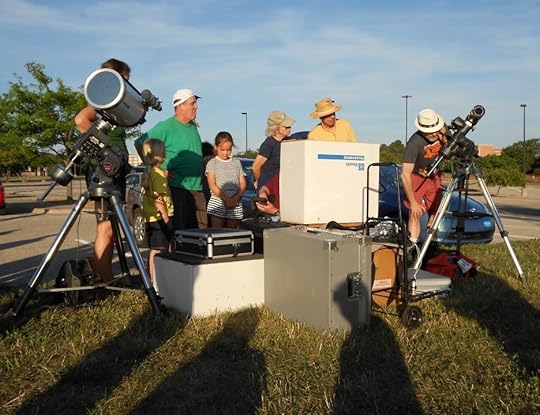 Oh, and here's what such a viewing party looks like; this shot was taken by Vijay Vasant Barve during last week's solar-eclipse party in the KU Lied Center's parking lot. That's me with my telescope, wearing a solar filter over the aperture and, I think at that time, also an Oxygen-3 filter. You can't see the other 'scopes behind the folks in the foreground.