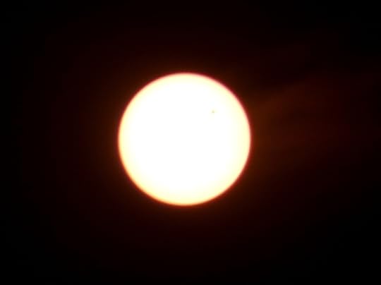 Here's how the transit looked, about two hours into the event, using my camera with no telescope, just zooming in on the Sun. You can see clouds hazing the image to the right, and just barely make out Venus in the upper-right: