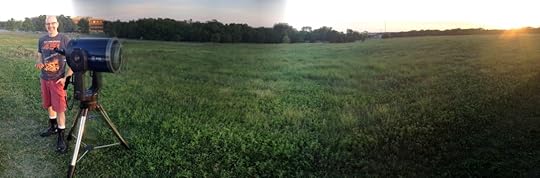 This first photo of me with my telescope was taken right at sunset. Oh, almost forgot to mention that I had to set up my 'scope for tracking by using an antique sextant! The clock-drive mechanism (counters the rotation of the Earth) requires two stars to align, unless you point precisely North and get the mount perfectly level. After I set it up the second time (batteries overheated and shut down after an hour), I got it so the Sun stayed CENTERED. Aw, yeah, old tech FTW. Lemme point out that this 'scope's drive uses GPS to sense location. Heh. GPS/sextent combo feels right somehow.Note the T-shirt, worn in honor of Ray Bradbury, who left us the day after.