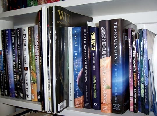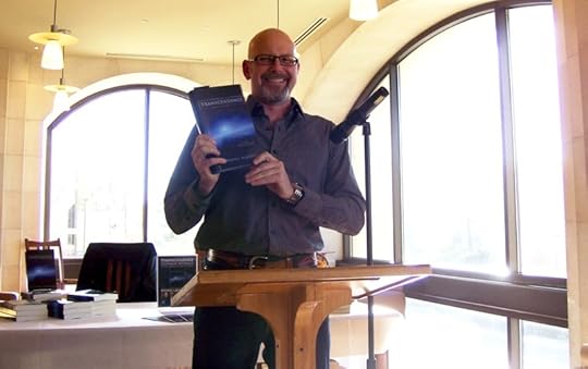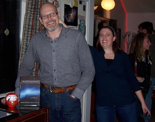 TRANSCENDENCE among some of my short stuff, on my bookshelves, at the release party.