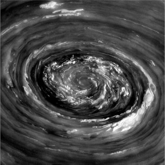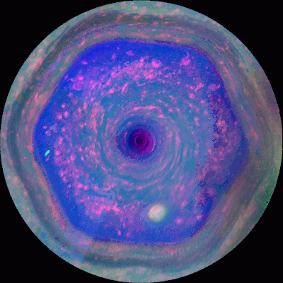 The clouds at the very center are spinning rapidly - almost twice as fast as the planet itself, with a period just over six hours. The direction of rotation is counterclockwise, like a northern hemisphere hurricane on Earth, except there is no ocean underneath. A similar feature exists at Saturn’s southern pole, and it spins in the same direction as that of a southern hemisphere hurricane on Earth. However, the hurricanes on Earth begin in the tropics and drift around. The polar hurricanes on Saturn are locked to their poles.