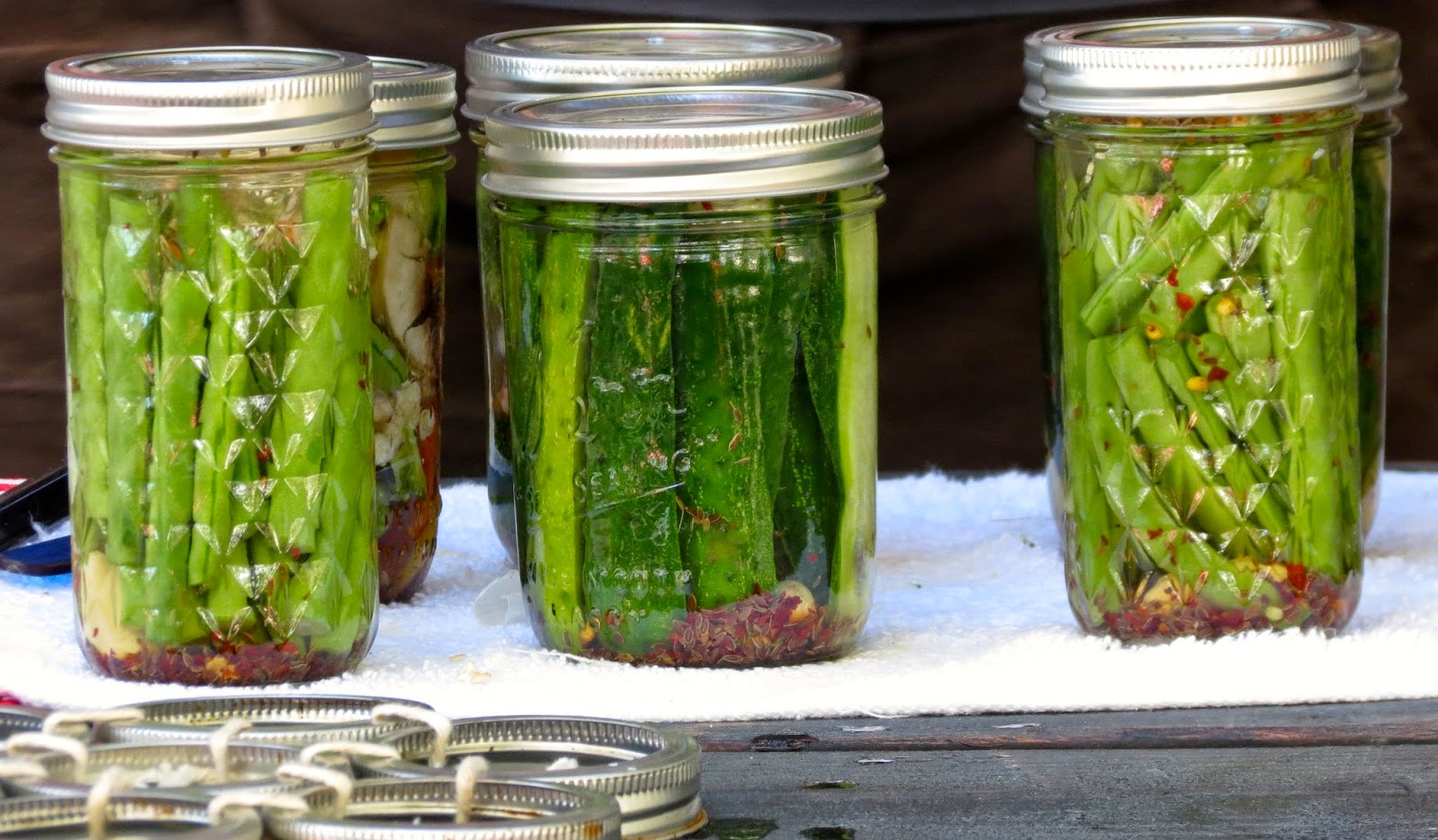 Another Hint: Don't buy the green or blue "vintage" canning jars. Your canned goods will look brown (mine sure did; these above are Linda's clear jars, much better).