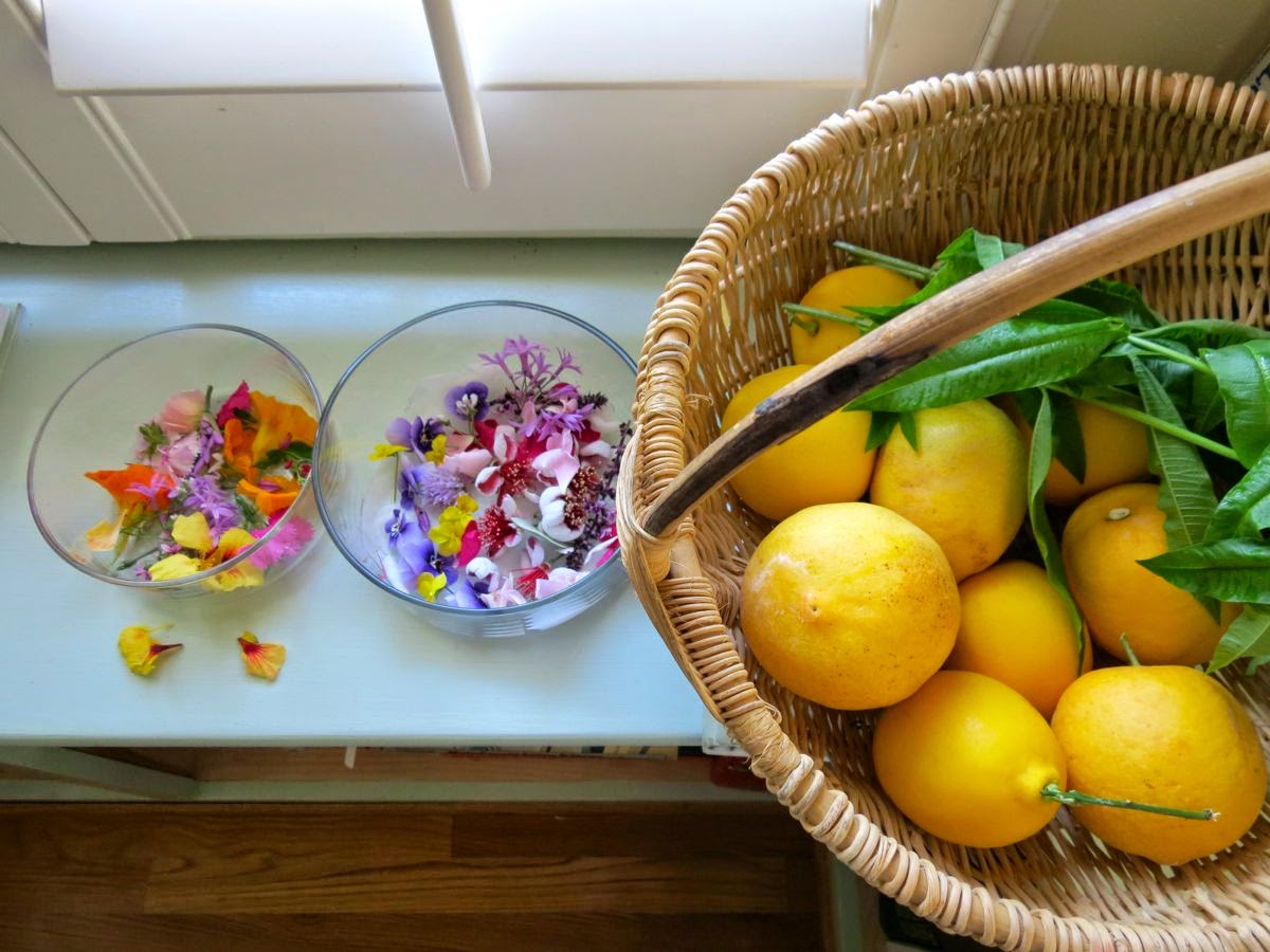 ...and herbs, lemons, and limes (the last of the crop). I use these for my edible flower cheeses...