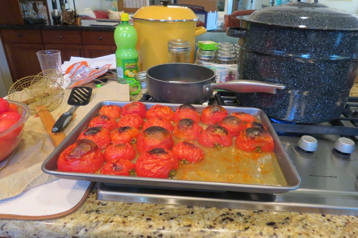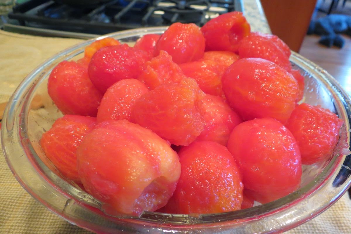 We'd pick bushels of fat, juicy tomatoes and tote them into the kitchen, wash them quickly, and slit a tiny X in the side of each one. Then we'd plop them, one-by-one, into a tall enamel pan of boiling water. They'd barely be in for a minute, then another quick dip of a big spoon and they were back out and sitting in a colander atop a cookie sheet.