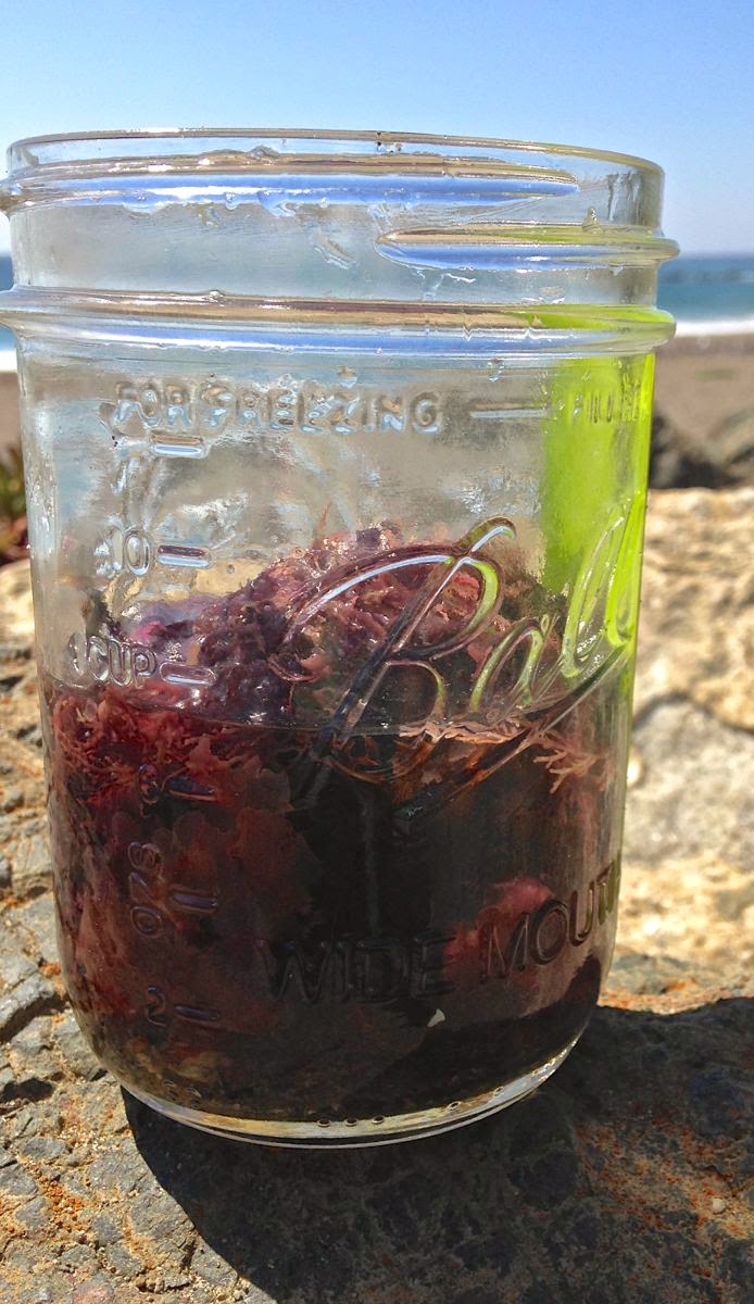 I walked along the beach until I found a tide pool full of water, which I collected in some canning jars. (See top photo). I dipped into the pools so as not to collect sand or debris in the water.