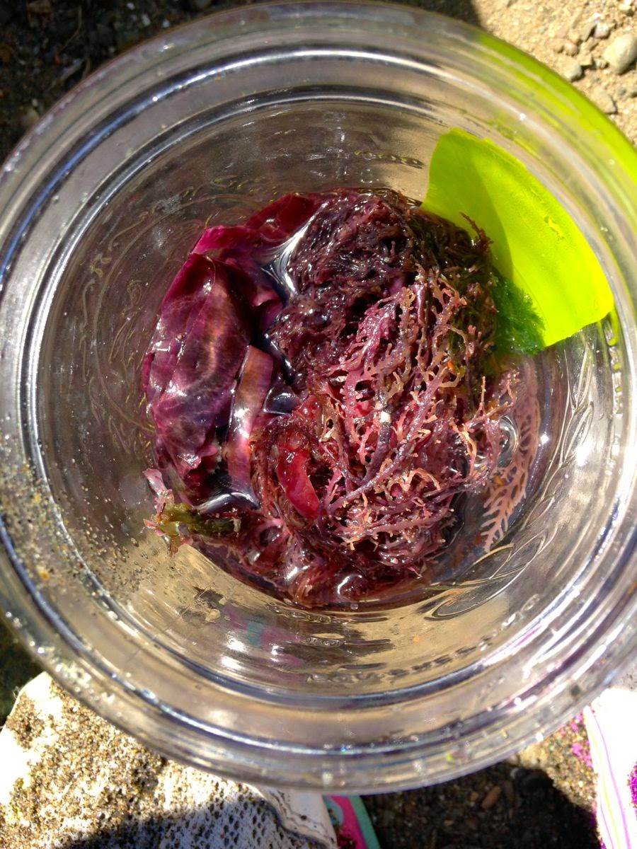 After I read Josie's book, I decided to try my hand at pressing seaweed. So, I grabbed one of my canning jars out of my trunk and wandered along the shore. Soon, I had a jar full of beauty.