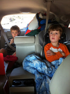 Yep, that's kid C watching a movie on the computer and Kid B watching the car's dvd. Because apparently the earth would stop rotating if the two of them actually agreed on a movie. What do people do with three kids?