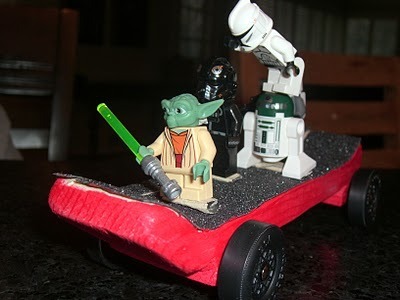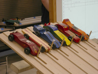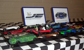 Because of the obvious aerodynamic shortcomings of the car, we warned Kid C that he should get used to being in everyone's rear view mirror. The people in his scout pack are obsessed with the science behind the speed of the Pinewood Derby car, so we didn't even attempt to compete. We went for style.