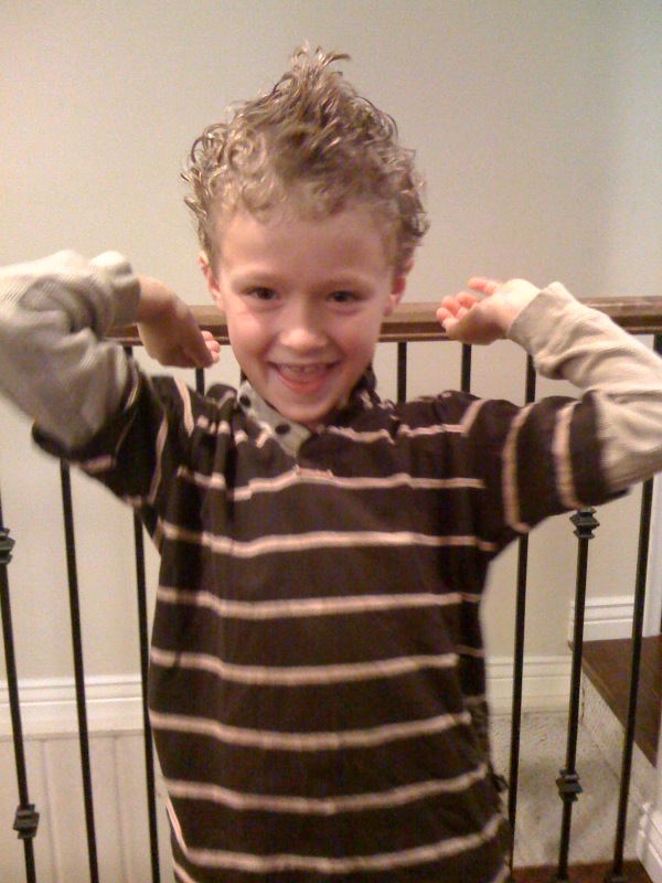 Then I hear strange noises coming from the bathroom. I walk in and find he's plastered his hair with my conditioner that smells like apples. His entire head is covered in goo. And his carpool will be here any minute.