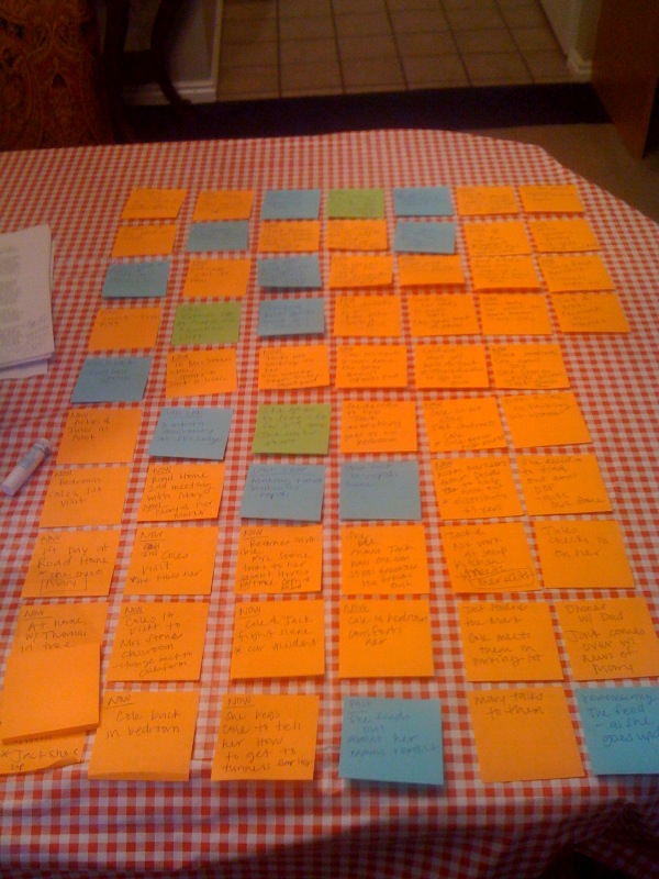 As Sam told you, I spent the last two days up in the mountains of Midway, UT, to do some revising. I took the trip because I was getting a little lost in my book - Alice down the rabbit hole kind of lost - so I decided to make a road map of it using post-it notes.