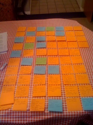 With my book made up of post-it notes, it was easy to put all the notes together, shuffle them like a deck of cards, and divvy them out evenly. The book doesn't make sense anymore, but according to the color wheel, it's pleasing to the eyes.