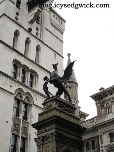 You are now entering the City of London...here be dragons! One of the weird things about London is that it's actually two cities for the price of one. The City is the square mile (well, 1.12 square miles) in the east that contains the likes of the Bank of England and Guildhall, and the area around it is Greater London. Boris Johnson might be Mayor of London, but the City has its own, the Lord Mayor of London, who holds office for a year. The City is pretty much the site of Londinium, and is therefore the oldest part of town, and the London Wall used to originally mark its boundaries. There are only fragments of it left, making it pretty useless as a wall, and I love the fact that they now use silver dragon statues to mark its boundaries. The dragons also appear on the City of London Corporation's crest, and some people think they refer to the legend of St George. This particular dragon marks the boundary between the City of London and the City of Westminster, and stands outside Temple Bar.