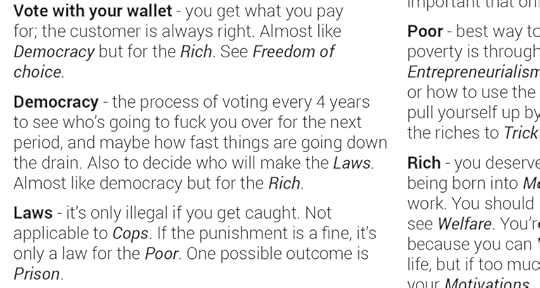 I’d much rather recommend some other dictionaries, in the vein of Ambrose Bierce‘s The Devil’s Dictionary, like CrimethInc‘s Contradictionary, the recurring word lists in Brand or my own Nyspråksordlistan for that matter. You can find the first version of mine in English in CBA vol 58 or a slightly different version in Swedish at Magasinet Konkret (it may also be published in book form at some point).