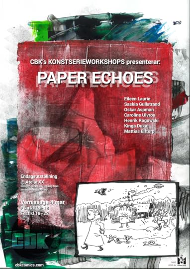 The cover was an experiment from a workshop (part of the workshops leading to the Paper Echoes exhibition) where we were supposed to put drawings into a pre-prepared non-linear panel grid. As a basis for the coloring I used a failed gelli-print from another of those workshops. It felt like a fitting image to use as a cover for this issue, with its storytelling theme.