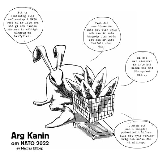 Nu är det ju lite sent och vårt enda hopp verkar ligga på Erdogan av alla rövhål till människor. Och/eller svenska politikers förmåga att ha integritet nog att inte sälja ut alla kurder i landet för att blidka honom. Men det är nog ungefär like troligt som att bara de som var för medlemskap kommer att behöva skicka ut sina egna barn i framtida NATO-krig. Den här Arg Kanin-bilden gjorde jag hursomhelst för inte så länge sedan till Tecknaruppropet Moment2022.