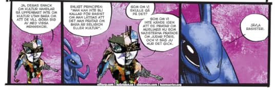 The theme of my comic was provoked by some of the latest outbursts of stupid neonationalism from the politically brown part of Swedish politics, where they thought that busdrivers should only be allowed to play purely Swedish music. Not because they normally play music on buses but because it was an opportunity to make a point designed to appeal to anyone who feels uneasy when they see a busdriver that is anything other than super White, or when they happen to hear music that was made in another country than Sweden (or USA, UK, Denmark or whatever else they count as Swedish/familiar/safe).