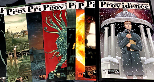 Alan Moore is easily one of the best and most interesting contributors to the mythos based on Lovecraft’s stories. Providence is at the moment quite hard to find (or it was, until the compendium edition was released recently) but well worth the effort. It was frustrating but kind of fitting since much of the story is about the main character trying to find a book. Each issue of the series, at least the first ten, is part comic, part entries from a notebook/journal written by the main character. It fucks up the reading rhythm a bit, but gives some extra insight into the character when you read his after-the-fact interpretations of what you’ve just read in the comic, as well as some events that weren’t shown in the comic pages. It shows how oblivious he is to certain elements, but also gives some insight to some of the context.