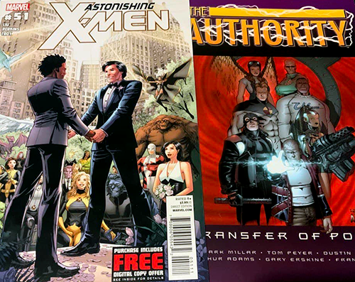 Speaking of The Authority, I have to mention something that has disturbed me. When Northstar got married in Marjorie Liu‘s Astonishing X-men, it was hyped in some places as the first gay superhero marriage. I don’t know what was actually the first one, but there’s AT LEAST the marriage of Apollo and Midnighter (who are pastisches of Superman and Batman, created by Ellis, married during Mark Millar‘s run). And that was in 2002, a bunch of years earlier than the X-men one.