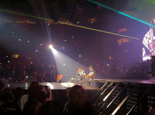 Jay-Z and Kanye West at Madison Square Garden, making an impromptu throne.