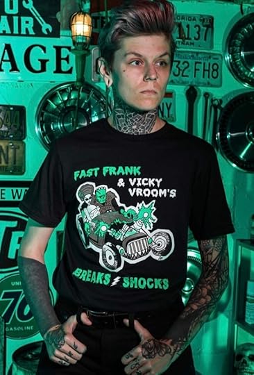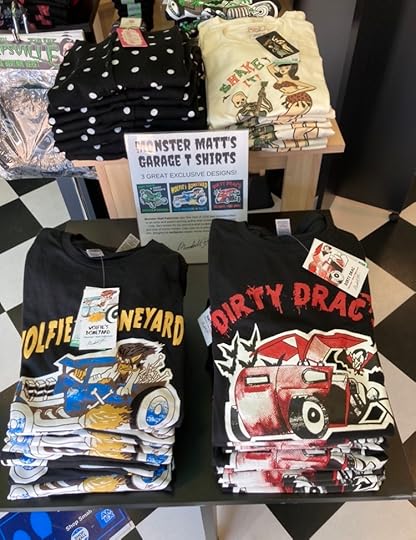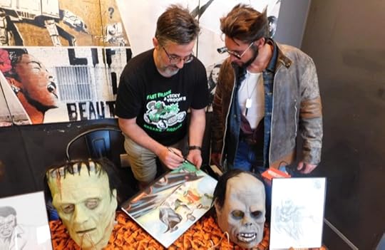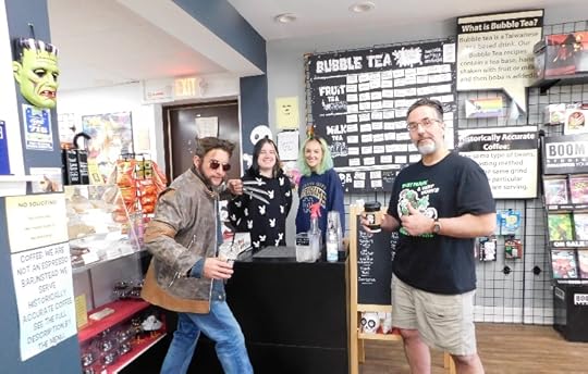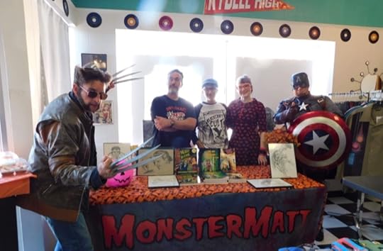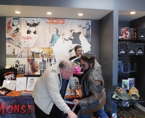In the first pictures, you’ll see Eric Elliott (Batman Meets Godzilla) , Maz Watkins(artist extraordinaire), Benjamin “Frankenstein” Cohen (Super Monster Fan), Thea Faulds (Theremin player ), and Tomb Dragomir (TombTV, Rue Morgue Radio) all sporting our shirts.