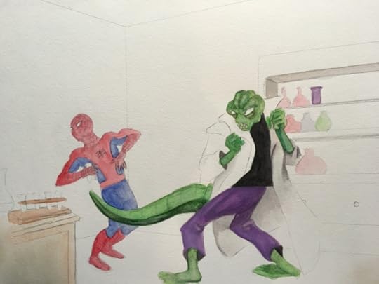 I love the 1960’s Spiderman cartoon and decided to paint a scene in watercolors. I took a screenshot and used that. I changed some minor things. Keep in mind that when I paint stuff like this, I’m like a cover band- I’ll get close but will infuse the project with my personal spin. Please enjoy…