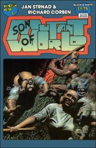 This grim tale ends with an ironic twist and a glimmer of hope. In 1990 Corben and Strnad returned to this world and released a five-issue comic series entitled SON OF MUTANT WORLD. Each issue features 12 pages of the title series and various back-up stories. At 60 pages, SoMW is nearly as long as the original and it is even more satisfying. Twenty or thirty years have passed in Mutant World, and the protagonist is now Dimenta, daughter of Dimento and a human clone escaped from a scientific enclave. Another character from the first book, Max, who escaped from the same enclave with another clone, founded a peaceful society that is threatened by the mutant hordes of a skull-faced barbarian called Mudhead. Due to financial hardships, only the first two of the five installments are in color—the last 36 pages are in black-and-white. However, it says a lot about the quality of the art and story that losing the color doesn’t diminish the reading experience in any significant way. Corben’s art is so spectacular, it transcends the loss of color.