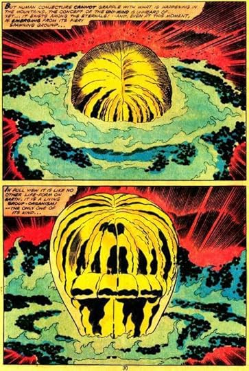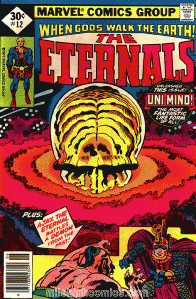 Among all the great ideas unveiled in THE ETERNALS, my favorite was the Uni-Mind. When all the Eternals of the world united, their atoms and minds combined into a single entity that looked like a giant brain and floated into the cosmos to solve unsolvable problems. The cover of issue #12 features the Uni-Mind and it’s one of my all-time favorite comic book covers.