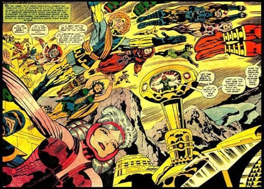 Instead of a supergroup of six or seven superpowered characters, Kirby gave us an entire RACE of them in the Eternals, immortal beings who have lived among humanity since prehistoric times, hiding in the cracks of our histories and legends, living on remote mountaintops and working miracles. At the same time he gave us their opposites, the twisted, warlike Deviants, who were also born of the same humble origins as Humans and Deviants, but were genetically unstable monsters.