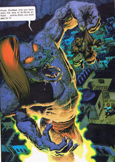 The story tells “The Last Voyage of Sindbad” and features Shahrazad herself telling a story within a story within a story. Corben’s artwork brings to life the opulence of golden palaces, the glitter of heaped treasures, and the glorious, mythic Arabia of the ancient world. There are Jinn, Ifrits, undead warriors on bat-winged horses, sword battles, dragons, a flying galleon, a man-eating Ogre, and a floating city of decadent sorcery. There’s really nothing like it.