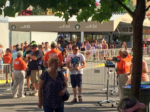 Line up as close as possible to any turnstile (including the temporary ones at the center gate) and watch the pre-opening skit on the balcony above the ticket booths at approximately 6:15 p.m.